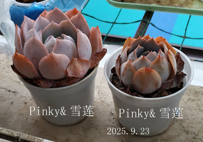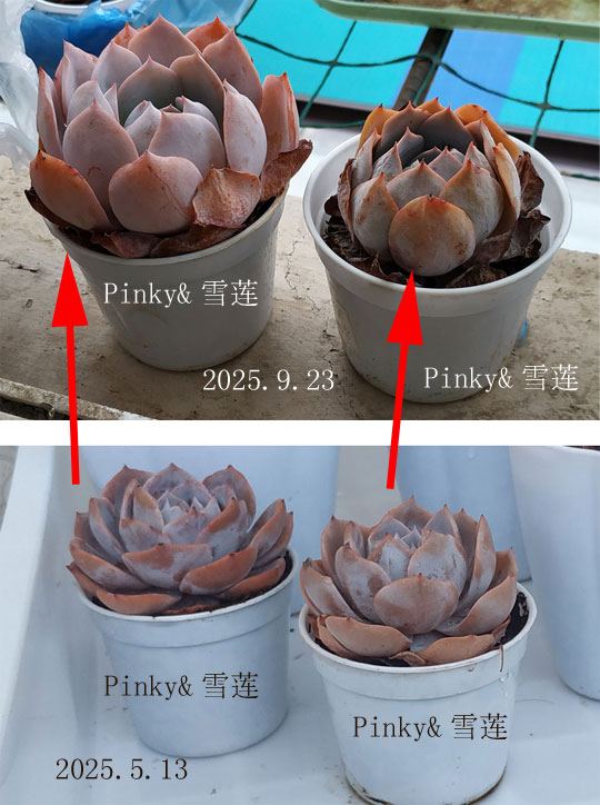 如下图的2棵 Pinky&雪莲,是4个多月前拍的,还是左右相同的位置。我对比了几个月,左边和右边2棵虽然是同一品种,但基因还是有差异的,左边更粉一些,右边更偏橙一些,各有特色。哪个好看?当然是粉色的好看一些。或者2棵颜色不一样,放在一起,有一种过度感,更好看。